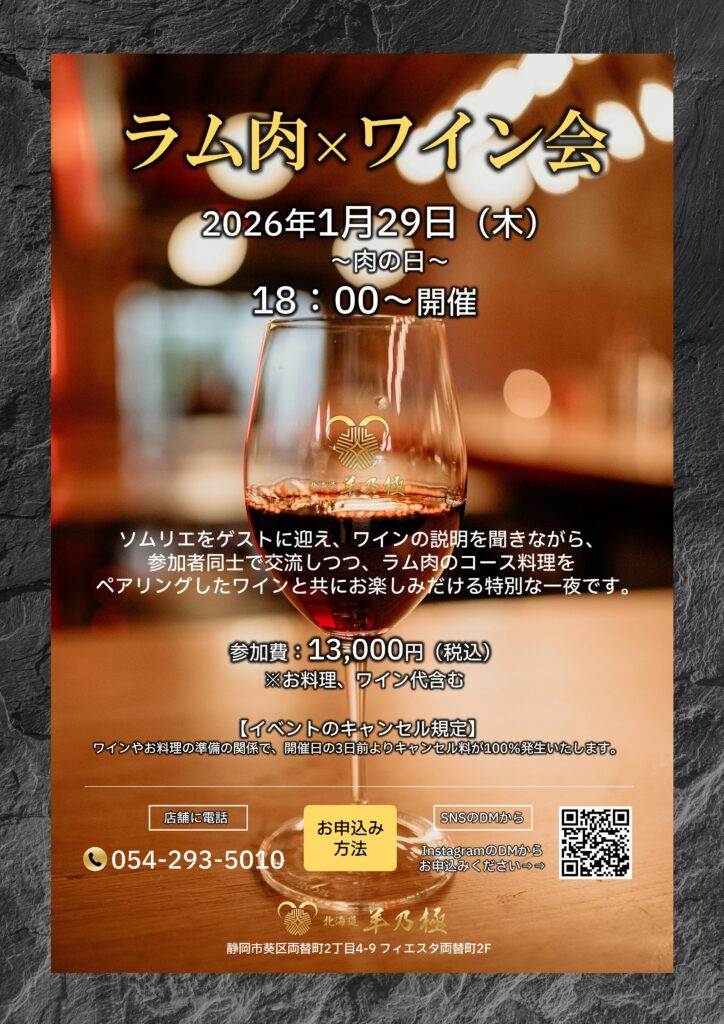 特別なラム肉のコース料理をペアリングしたカジュアルワインにてお楽しみいただきます。
